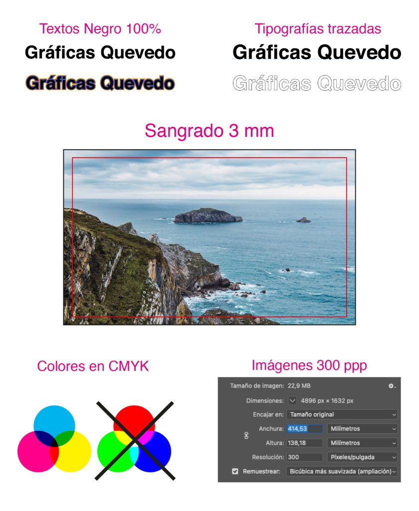 ·Siempre tienen que estar en CMYK (no RGB, no sRGB, no «como salga en el móvil»)