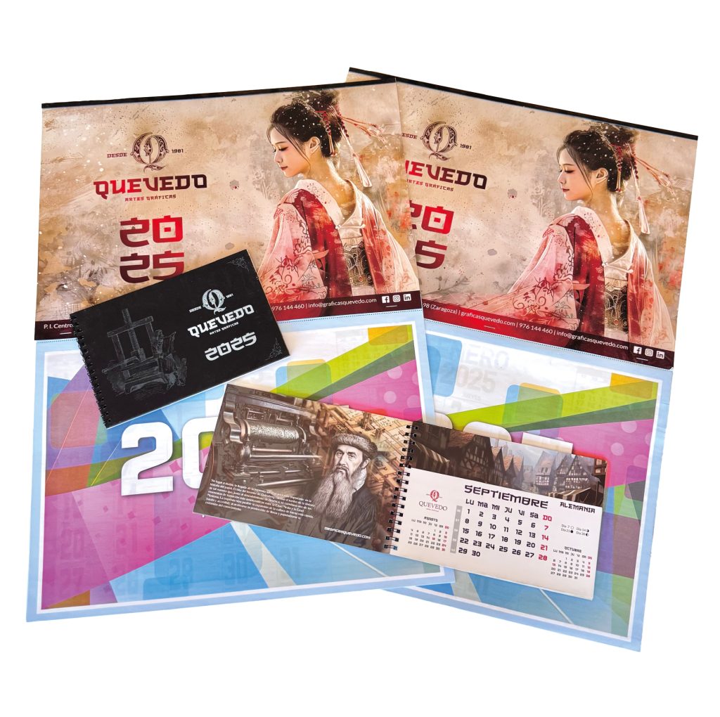 · Calendarios de sobremesa: Versátiles y cómodos para tener a mano en la mesa del despacho. Para estos calendarios tenemos la opción de escoger a través del catálogo y personalizar la base con los datos de empresa, o realizarlos totalmente personalizados y hacer el calendario según tus necesidades.