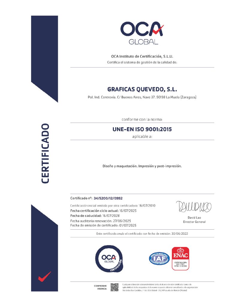 Trabajamos con materiales certificados con el FSC (Forest Stewardchip Council) y el PEFC (Programa para el Reconocimiento de Certificación Forestal) que justifican nuestro compromiso con la sostenibilidad. Además cumplimos con el RSA (Responsabilidad Social de Aragón) y con el certificado de calidad OCA ISO 9001 – 2015, que avalan la responsabilidad social y gestión de calidad que poseemos.